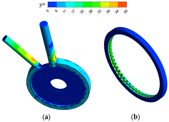 The SST k-ω turbulence model generally requires that the model grid’s y+ value does not exceed 100 [28]. The y+ distribution plot for the vortex pump is shown in Figure 5. Herein, the maximum y+ value is 48.7. The average y+ value in the impeller region is 13.5, in the external flow passage region is 16.7, and in the clearance region is 1.4. Overall, the y+ values across the entire grid are within the reasonable range for numerical simulation.