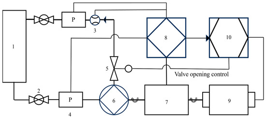 Schematic diagram of test bench. 1—Water storage tank. 2—Ball valve. 3—Flowmeter. 4—Pressure sensor. 5—Solenoid. 6—Vortex pump. 7—RPM torque gauge. 8—Data acquisition board. 9—Variable frequency motors. 10—Computer.