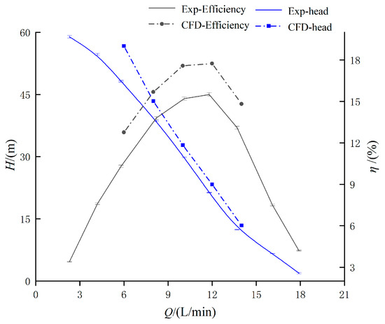 The comparison between the numerical simulation results and the experimental data is shown in Figure 7, where the error bars represent the experimental uncertainty. The trends of the experimental results are generally consistent with the numerical simulation results. Specifically, the head decreases sharply with increasing flow rate, while the efficiency initially increases and then decreases with increasing flow rate. However, there are still discrepancies in the numerical magnitudes between the two sets of results, especially at low flow rates. There are two main reasons for this discrepancy. Firstly, appropriate simplifications were made in the numerical simulation, neglecting various objective factors such as energy leakage and losses in the connecting pipelines. Under low flow conditions, the internal pressure of the pump is higher, resulting in greater energy losses caused by the connecting pipelines. Secondly, due to the special working principle of the vortex pump, the pump is filled with a large number of vortices of different scales under low flow conditions leading to a highly turbulent internal flow, which poses challenges for high-precision numerical simulation. Although there is a certain gap between the numerical simulation results and the experimental data, the trends of the two sets of results are consistent, and the errors are within a controllable range. Therefore, the numerical simulation results are relatively accurate and reliable, and suitable for subsequent research.