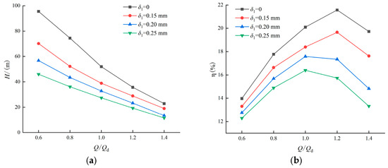 To investigate the influence of axial clearance size on the performance of the vortex pump, the external characteristic curves for each clearance scheme are shown in Figure 8. Figure 8a illustrates the variation in head for each clearance scheme. It can be observed that the trend of head curves for each scheme is generally consistent, transitioning gradually from low flow and high head to high flow and low head. As the clearance increases, the magnitude of head reduction with increasing flow rate also increases. Specifically, when the axial clearance is 0, the head decreases from 95.53 m to 22.86 m. When the axial clearance increases to 0.25 mm, the head decreases from 45.97 m to 11.53 m. Thus, the axial clearance to some extent determines the slope of the head curve of the vortex pump. At the same flow rate, the head decreases with increasing axial clearance, and this decreasing trend diminishes with increasing flow rate. With the increase in axial clearance, at the 0.6Qd operating condition, the head decreases from 95.53 m to 45.97 m; at the 1.4Qd operating condition, the head decreases from 22.86 m to 11.53 m. The impact of axial clearance on head is more significant at low flow conditions.