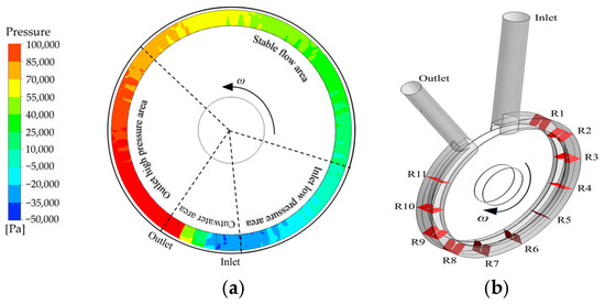Figure 9a depicts the pressure distribution inside the vortex pump. It can be observed that the pressure distribution within the vortex pump gradually increases circumferentially. Under the driving force of pressure difference, fluid from high-pressure regions flows through the axial clearance towards low-pressure regions. According to Reference [29], the annular flow passage is divided into several regions based on the growth pattern of internal pressure and pressure distribution within the vortex pump. These regions include the inlet low-pressure region, stable-flow region, outlet high-pressure region, and tongue region. Among these, the stable-flow region is characterized by fully developed internal circulation within the vortex pump, where stable momentum exchange occurs between the fluid inside and outside the impeller. The majority of pressure increase within the vortex pump is concentrated in this region, making it the critical area determining the operational capacity of the vortex pump. The internal flow within the axial clearance is intricate, exhibiting different flow characteristics in various regions. To analyze the flow field variations in different regions of the vortex pump under different operating conditions, radial analysis sections are taken along the flow direction starting from the inlet low-pressure region. One radial analysis section comprises four channels, resulting in a total of eleven sections. Sections R1 to R3 are located in the inlet low-pressure region, R3 to R9 are in the stable-flow region, and R9 to R11 are in the outlet high-pressure region. A schematic diagram of the section positions is shown in Figure 9b.
