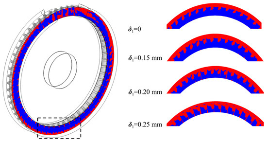 The mass exchange distribution at the interface between the impeller and the external passage in the stable-flow section for various clearance schemes is shown in Figure 10. The blue area represents fluid entering the impeller passage from the external passage, while the red area represents fluid exiting the impeller passage. In all four schemes, the boundary between fluid entering and exiting is located at a height corresponding to 70% of the blade height. At δ1 = 0, the fluid-entering area forms a continuous band that spans from the inner diameter to the mid-diameter of the impeller. As the axial clearance increases, the entering area gradually changes into a discrete block distribution, with a decreasing entering area. Additionally, noticeable gaps appear between the impeller flow channels, indicating that with larger axial clearances, the intensity of mass exchange inside the vortex pump gradually decreases.
