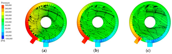 Figure 11 illustrates the pressure distribution and axial clearance streamline distribution for each clearance scheme under rated conditions. In terms of pressure distribution, the increase in clearance leads to an increase in volume loss for the vortex pump. Consequently, there are significant variations in internal pressure among the different clearance schemes. When the axial clearance is 0.15 mm, the fluid undergoes repeated pressurization in the later stage of the annular flow passage, reaching a high-pressure state. However, when the axial clearance increases to 0.25 mm, some areas in the pump outlet region still fail to reach a high-pressure state.