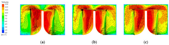 Velocity vector distribution of R6 cross-section with different clearances. (a) δ1 = 0.15 mm. (b) δ1 = 0.20 mm. (c) δ1 = 0.25 mm.