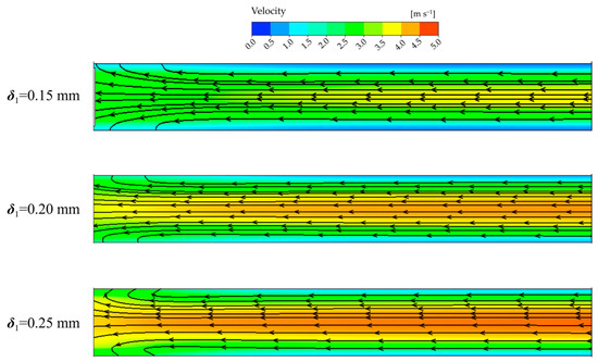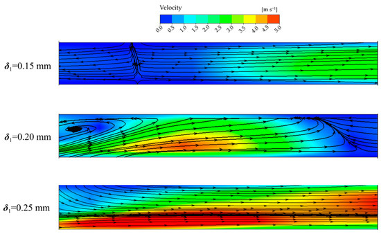 Figure 14 illustrates the velocity streamlines of the clearance at the radial section R6 of the stable-flow region for each clearance scheme under rated conditions. It can be observed that when the clearance value is 0.15 mm, flow separation occurs at the clearance inlet, with the fluid flowing back to the main passage and some flowing towards the radial direction inside the clearance, all in a laminar manner. At a clearance value of 0.20 mm, significant vortices appear at the clearance inlet, with a small portion of the fluid accelerating towards the radial direction inside the clearance from the vicinity of the moving wall region. When the clearance value increases to 0.25 mm, the reduction in flow resistance due to the enlargement in the clearance size results in smoother clearance flow. After entering the clearance passage from the main passage, some streamlines near the stagnant wall surface at the clearance inlet area experience bending and twisting. However, beyond this region, the overall streamlines remain parallel, and the fluid flow becomes more orderly.