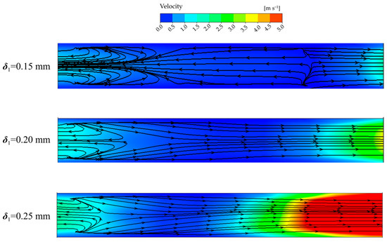 Figure 15 illustrates the velocity streamlines of the clearance in the radial section R10 of the high-pressure region at the outlet of the vortex pump for different clearances. It can be observed that there are significant differences in the internal flow characteristics of the clearance in this region under different clearances. Specifically, with the increase in clearance, the backflow at the clearance inlet significantly weakens. This is because the increase in clearance size provides the fluid with a larger flow space to adapt to the velocity changes caused by the channel variation, thereby reducing the phenomenon of flow separation. As mentioned earlier, the clearance fluid in this region gradually returns to a more stable flow state after passing through the turbulent zone at the clearance inlet. During this process, kinetic energy is redistributed, and the fluid velocity gradually increases. With the increase in clearance, the acceleration amplitude of the fluid after passing through the turbulent zone also increases gradually. The main reasons are twofold: firstly, the increase in clearance provides the fluid with a larger space for flow separation recovery, and secondly, the vortices cause energy loss. With the increase in clearance, the reduction in vortices leads to less energy dissipation, resulting in more energy being available for subsequent kinetic energy distribution.