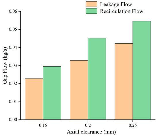 As mentioned earlier, there is a significant phenomenon of fluid recirculation within the vortex pump. To analyze the impact of leakage flow and recirculation flow on the internal flow field and external characteristics of the vortex pump, Figure 17 shows the distribution of internal leakage flow and recirculation flow under rated conditions for various clearance schemes. It can be observed that in all clearance schemes, the recirculation flow is always greater than the leakage flow. The main reason for this is that the leakage flow in the vortex pump is mainly concentrated in the high-pressure area at the outlet. In this region, there are a large number of vortices at the entrance of the clearance, which partially block the leakage flow. On the other hand, the recirculation flow in the vortex pump is mainly concentrated in the low-pressure area at the inlet, where there are no vortices to obstruct the recirculation, resulting in much lower flow resistance for recirculation compared to leakage flow.
