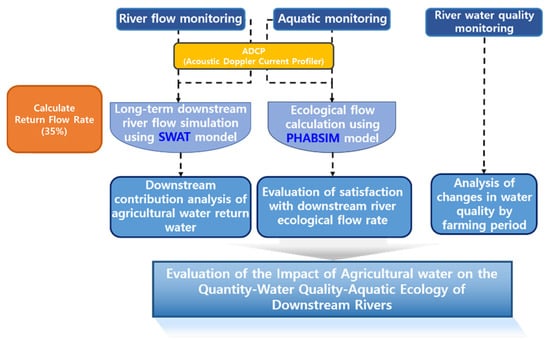 In this study, the river flow and water quality were monitored in the main stream and inflow streams of the reservoir irrigation district (this study site), and aquatic health was evaluated using data from the National Biometric Network and previous studies [,]. In addition, the return flow for agricultural water was calculated using the reservoir supply data, and the long-term flow rate of downstream rivers was simulated using the Soil and Water Assessment Tool (SWAT) model to evaluate the impact of the return water on river function maintenance. Using the simulation results of the optimal ecological flow, the impact of return water for agricultural use on the environmental ecological function of the downstream rivers was evaluated (Figure 1).
