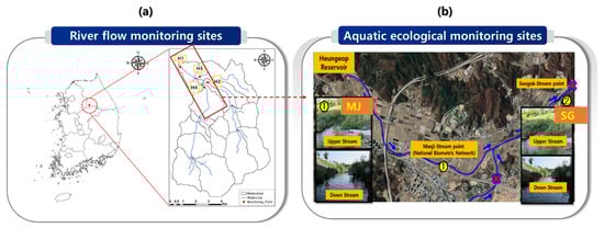 In this study, monitoring was conducted to assess the health of aquatic ecosystems in a downstream river of a district receiving agricultural water, utilizing methods such as the Trophic Diatom Index (TDI), Benthic Macroinvertebrate Index (BMI), and Fish Assemblage Index (FAI) at selected aquatic ecological monitoring sites. Additionally, representative fish species were selected based on fish surveys, and their optimal ecological flow was calculated to evaluate the impact of agricultural water on the downstream river’s aquatic ecology. Monitoring was conducted on downstream rivers directly affected by agricultural return flows from the Heungeop Reservoir (Figure 2b), and the investigation point was selected to reflect the current operating aquatic ecological monitoring sites (operated by the Ministry of Environment) to verify aquatic ecosystem monitoring data. The SG monitoring site was selected for its suitability for aquatic ecological monitoring, including fish surveys, due to adequate space available near the downstream flow and water quality monitoring sites conducted in this study. For the MJ site, located upstream, a currently operating national biometric network site was chosen, allowing for comparative validation of the aquatic monitoring performed in this study. Therefore, we selected point MJ, which was, to some extent, secured from the upstream flow, and we selected the point SG near the Bonghyeon Bridge located at the end of the beneficiary area as the branch.