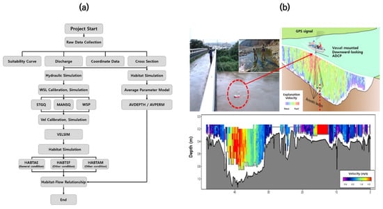 PHABSIM modeling process and river sections/depth-specific velocity measurements using ADCP (a,b). Red dotted circle means the ADCP equipment in operation on site.