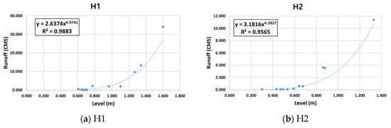 The flow rate at point H1 showed the largest change after rainfall and was the lowest, at 0.170 m3/s, in May, the dry season. Similarly, the flow rate at point H2 was the highest, at 3.641 m3/s, in July, and the lowest, at 0.059 m3/s, in May. At point H3, the basin area was small, and the flow rate was 1.206 m3/s in August, the flood season. At point H4, the flow rate was 0.527 m3/s at the 9th measuring time point but only 0.055 m3/s at the 11th measuring time point after a relatively long period of rainless days (26 days). The water level flow curves for H1 and H2 were calculated to be y = 2.6374 × 4.9741 (R2 = 0.988) and y = 3.1816 × 4.2827 (R2 = 0.956), respectively, using flow rate data obtained from river flow monitoring and water level data at H1 and H2, where water level gauges were installed (Figure 4).