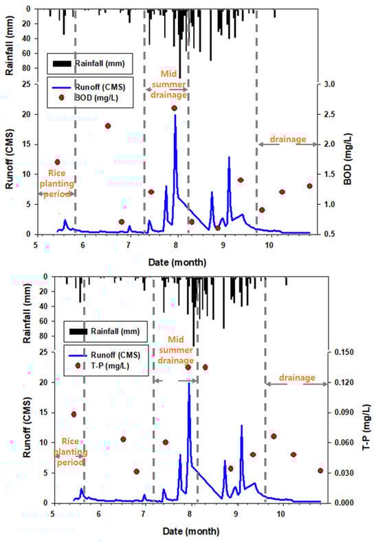 To assess the impact of agricultural water discharge on downstream river water quality during the farming season, additional monitoring of the river water quality was conducted at point H1 (Bonghyeon Bridge) located at the outlet of the basin. In this study, biological oxygen demand (BOD5) and total phosphorus (T-P) were chosen as indicators to evaluate the quality of agricultural water. BOD5 was selected because it measures the level of organic matter contamination and is widely used in water pollution assessments. T-P was chosen as it represents non-point source pollutants such as agricultural and livestock wastewater and serves as an indicator of eutrophication in rivers and lakes. Moreover, in Korea, the current Total Maximum Daily Load (TMDL) program sets and manages water quality targets for the BOD5 and T-P. The BOD5 was measured using the method that involves collecting a water sample, measuring its initial dissolved oxygen (DO) level, incubating it at 20 °C in the dark for five days, remeasuring the DO, and calculating the oxygen depletion to determine the organic pollution level. Total phosphorus (TP) was measured by digesting the water sample with acid to convert all phosphorus forms to orthophosphate, which was then quantified using a spectrophotometer after reacting with a color reagent, typically resulting in a blue color. Water quality monitoring was conducted on the same dates as the river flow monitoring, including 14 May, 16 June, 25 June, 14 July, 29 July, 10 August, 27 August, 11 September, 25 September, 8 October, and 26 October, totaling 11 sessions. Water quality analysis was performed by collecting samples and transporting them to a laboratory, where they were analyzed according to the water pollution testing standards. According to the management manual for each crop (agricultural day management schedule) proposed by the Rural Development Administration, the management schedule varies depending on the climate characteristics and temperature of the year, but the rice field is usually drained completely for 30–35 days from the end of September to October. From November to December, the rice straw is ploughed to prepare for farming activities in the following year. In this study, the effect of agricultural water discharge on the water quality of downstream rivers during rainy periods was evaluated in different farming management periods.