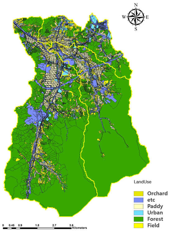 The agricultural land area in the irrigation district of the Heungeop Reservoir is 815.2 ha, accounting for 14.5% of the total basin area (Figure 6). The fertilizers used for soil amendment and agricultural activities during rainy periods, including the end of May, the end of July to early August, and the end of September to October, were found to affect water pollution in the river. The effect of agricultural water discharge on the river water quality was limited, except for run-off during intensive farming periods. Therefore, appropriate measures should be taken to reduce pollutant runoff during water drainage periods. In addition, the target water quality for small basins in the future should be set according to the characteristics of the basin and in agricultural areas, considering the characteristics of the different farming periods. However, as this study did not account for the effect of prior precipitation and analyzed only short-term monitoring data, it is necessary to analyze long-term river water flow and quality and account for prior rainfall in future studies.