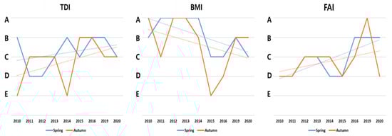 Analysis of past aquatic health evaluation data (TDI, BMI, FAI) of the MJ site.