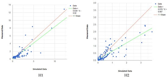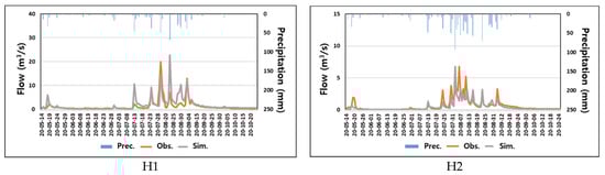 Simulation of the river flow rate using the SWAT model revealed R2 = 0.737, NSE = 0.706 at point H1 and R2 = 0.749, NSE = 0.673 at point H2, all of which were rated as good, indicating that the model well simulated reality (Figure 8). Although model optimization was limited by a slight difference between the precipitation data collected at the weather station and flow measurement data obtained through monitoring, the results of the river flow measurements and simulation showed similar trends, as shown in Figure 9.
