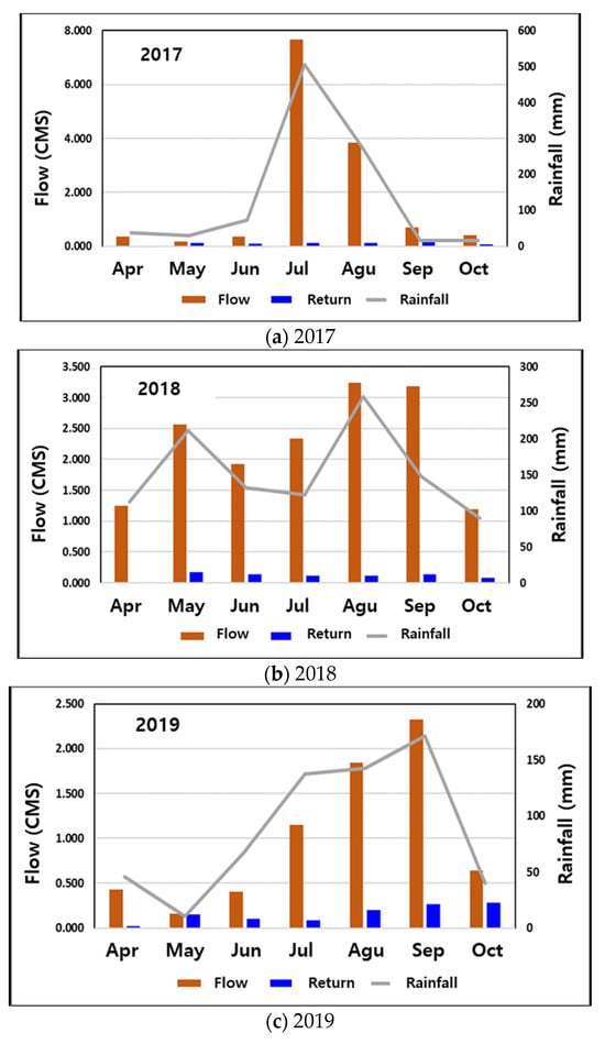 The ratio of return water to main stream flow was 1.5–77.8% in 2017, 1.4–7.0% in 2018, and 5.7–96.5% in 2019. Therefore, it differed depending on the rainfall, ranging from a minimum of 1.4% to a maximum of 96.5%. The ratio of return water to main stream flow, excluding the inflow tributary flow at the end of the beneficiary area downstream of the Heungeop Reservoir, was 1.4–100.0% in 2017, 2.3–15.4% in 2018, 10.7–100.0% in 2019, and 6.5–35.9% in 2020. This ratio also differed depending on the rainfall, ranging from a minimum of 1.4% to a maximum of 100.0%. Comparison of the flow rate and return water by season for each year revealed that the fiver flow significantly increased during summer rainfall; therefore, the effect of the return water was generally small, but during the rainy season (April–June), it was significant.