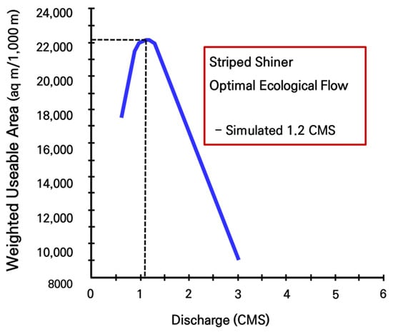 The optimal ecological flow rate for a representative fish species, striped shiner, was calculated considering the performance of river and aquatic ecology monitoring using the PHABSIM model and was approximately 1.2 m3/s, as shown in Figure 11. Furthermore, according to the literature review [], the optimal ecological flow for striped shiner was found to be 1.0 m3/s, which is similar to the results of this study. It also indicates that the optimal ecological flow rate for striped shiner is 1.2 m3/s, which implies that the habitat area for striped shiner is the most widely distributed
