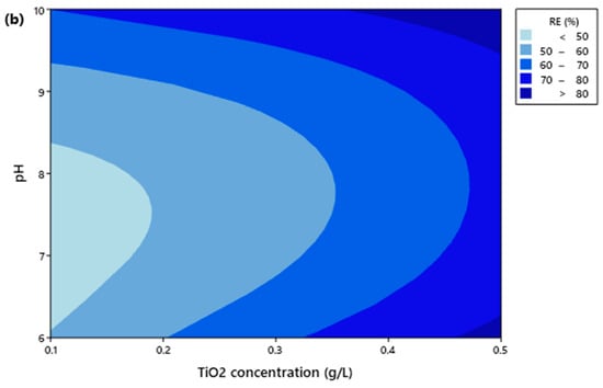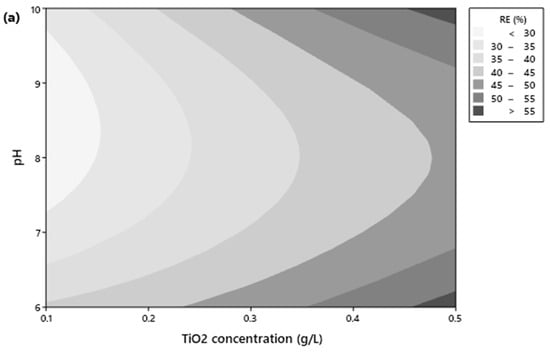 Removal (RE) of (a) protein and (b) carbohydrates from AOM with TiO2/UV using different values of pH (6 to 10) and TiO2 concentration (0.1 to 0.5 g∙L−1). The experiments were carried out for 2 h.