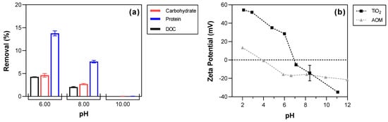 (a) AOM adsorption with TiO2 measured in terms of protein, carbohydrate, and DOC removal. The experiments were completed under continuous agitation at 80 rpm for 2 h with 0.5 g∙L−1 TiO2 without UV light. (b) Zeta potential measurements of AOM and TiO2 over pH range.