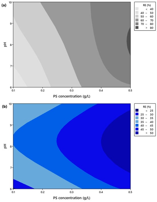 Removal (RE) of (a) protein and (b) carbohydrates from AOM with PS/UV using different values of pH (6 to 10) and PS concentration (0.1 to 0.5 g∙L−1). The experiments were carried out for 2 h.