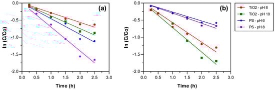 The optimal conditions for the TiO2/UV and PS/UV processes for AOM degradation were found at different times (0.25 to 2.5 h). The UV doses tested varied from 0.59 (0.25 h) to 5.92 (2.5 h) J∙cm−2. The results found were modelled using the pseudo-first-order model (Equation (1)).