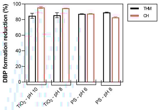 Reduction in disinfection by-product (DBP) formation after the application of TiO2/UV and PS/UV. The experiments were carried out using 0.5 g∙L−1 TiO2/PS at different pH values for 2.5 h.