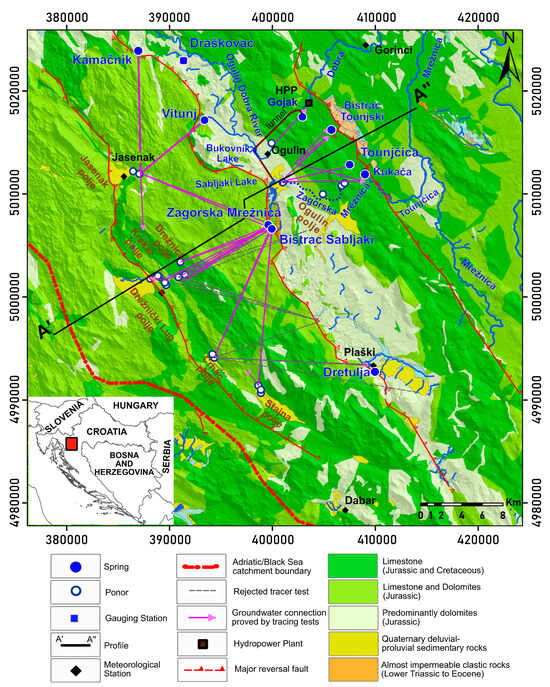 - Lukač Reberski, J.; Marković, T.; Nakić, Z. Definition of the river Gacka springs subcatchment areas on the basis of hydrogeological parameters. Geol. Croat. 2013, 66, 39–53. [Google Scholar] [CrossRef]