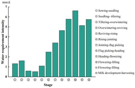 The water requirement of the same crop is different in different growing periods. It has been shown that during the entire fertility period of wheat from sowing to milky harvest, the following stage has the highest water demand intensity (see Figure 2). The water demand intensity of cotton at the growing stage reaches its peak at the filling stage and fruit expansion stage [42,45].