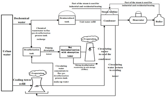 Industrial water demand generally refers to the water demand of enterprises in the production process and manufacturing processing, cooling, washing, etc. It is affected by factors such as the scale of production, production structure, progress in water-saving technology, and price. The expansion of the industrial production scale is the main factor driving the growth of industrial water demand. However, whether there is a high water consumption in the industry and its proportion to the industrial structure will have an important impact on industrial water use. Typical high-water-consuming industries include the thermal power generation, iron and steel, textile, paper, and chemical industries, which account for about two-thirds of total industrial water consumption [48]. These high-water-consuming industries use water mainly for cooling and washing. Among them, the thermal power generation industry uses water mainly in the water vapor cycle system, i.e., water for the thermal system, cooling system, heating system, and hydraulic ash removal and slag discharge system. These account for about 40% of the total industrial water use (see Figure 3). The main water uses in the chemical industry are cooling water, heating and processing water, and washing water (circulating cooling towers in chemical plants account for more than 45% of the water consumed in chemical plants). These water uses account for about 8% of total industrial water use. The steel industry mainly uses water for sintering (pellets), coking, iron, steel, steel rolling, and other processes of the production process and equipment cooling. These account for about 5% of total industrial water consumption. The water in the textile industry is mainly used for the preparation and rinsing of various kinds of fabric pre-treatment processes, dying, printing solutions, and for rinsing water after fabric finishing. These account for about 4% of the total industrial water use. Paper industry water mainly includes pulping water, paper, and cardboard production process water. These account for about 3.5% of the total industrial water use [8].