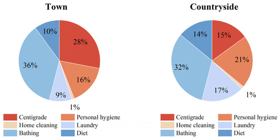 Residential water use has become a new source of water growth. China’s annual water consumption for domestic use rose from 600 million m3 at the early days of the founding of the China to 28 Gm3 in the 1980s, and will further increase to 64.78 Gm3 in 2022, with an average annual growth rate of 880 million m3. Per capita water consumption also increased from 78 L/(person-d) in 1980 to 125 L/(person-d) in 2022, with an average annual growth rate of 1.4% [58]. Domestic water use mainly consists of seven parts: drinking water, cooking water, washing water, environmental cleaning water, laundry, bathing water, and toilet flushing water. Urban households use the highest proportion of water for bathing, with an average of 43 L/(person-d), accounting for about 36% of total water use. Toilet flushing and personal hygiene are also behaviors that use more water, with an average water consumption of 30 L/(person-d) and 25 L/(person-d), respectively, accounting for about 28% and 16% of the total water consumption. Eating and drinking, laundry, and household cleaning are mostly communal household behaviors, with relatively low per capita water use and a direct correlation to household size, accounting for 10%, 9%, and 1% of the total water use, respectively (see Figure 4). Per capita water consumption in rural households is about 60–140 L/(person-d). Bathing, toilet flushing, and personal hygiene are also behaviors that account for the highest proportion of water use in rural households, with a water consumption of about 30–70 L/(person-d), accounting for 50–70% of the total water consumption.