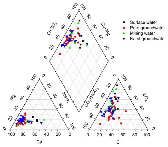 A Piper trilinear diagram is a commonly used tool for presenting water chemistry data. Its purpose is to directly represent the relative abundance and distribution characteristics of major ions in water chemistry, thereby assisting in the identification of end-members of hydrochemical formation and evolution [22]. As illustrated in Figure 2, the distribution of hydrochemical types is relatively concentrated, with cations predominantly distributed near the Ca2+ and Mg2+ ends, while anions are mainly distributed near the HCO3− and SO42− ends. In particular, pore groundwater is primarily of the HCO3∙SO4-Ca and HCO3-Ca types, accounting for 56.5% and 13.0%, respectively. Karst groundwater and mine water are mainly of the HCO3∙SO4-Ca types, accounting for 80.0% and 77.7%, respectively. This indicates that each water body is mainly influenced by carbonate rock weathering and dissolution, in the form of sulfide mineral oxidation and sulfate mineral dissolution.