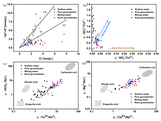 The primary sources of Na+ and K+ in natural water bodies are the weathering of silicate minerals and evaporite rocks. Cl− remains relatively stable in groundwater and is mainly derived from the weathering and dissolution of evaporite rocks. When Na+, K+, and Cl− in groundwater are derived from the weathering and dissolution of rock salts in the aquifer, the value of γ(Na+ + K+)/Cl− should be equal to 1. Figure 3a illustrates the distribution of sampling points across the study area, which is generally scattered. In pore groundwater, the ratio of (Na+ + K+) to Cl− is less than 1 for most ions, indicating that except for the dissolution of rock salts, Na+ and K+ can more easily be absorbed by mineral surfaces and Cl− may be influenced by anthropogenic pollution. In contrast, for some karst groundwater, the ratio of (Na+ + K+) to Cl− is greater than 1, indicating that the Na+, K+, and Cl− mainly originate from the weathering and dissolution of evaporite rocks. Nevertheless, γ(Na+ + K+)/Cl− is less than 1 in certain locations, suggesting the potential influence of other sources. For mine water and surface water, γ(Na+ + K+)/Cl− is more than 1, indicating that Na+ and K+ in groundwater are not balanced by Cl−. This could be attributed to ion exchange among Na+, Ca2+, and Mg2+ [23], or potential influences from other sources of Na+, such as anthropogenic inputs, etc.