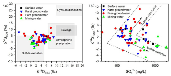 Figure 4a,b illustrate the relationships between δ34S-SO4 and δ18O-SO4 and δ18S-SO4 and SO42− in various water bodies within the study area. It is evident that the values of the majority of sample points fall within the range of sulfide mineral oxidation, suggesting that nearby coal mining activities have a significant impact on the sulfate concentration in the regional water bodies. Furthermore, the values of δ34S-SO4 of mine water are lower than those of the other two types of groundwater, indicating a greater influence of mineral oxidation on coal mine water. Based on the relationships between δ18O-SO4 and SO42−, the majority of mine water and some pore water and karst water samples are located in the lower-right area, indicating a significant influence of sulfide mineral oxidation. Some pore water and karst water samples are situated in the upper-right area of gypsum dissolution, indicating that the sulfate concentration in the groundwater is generally higher due to the combined effects of several factors. Moreover, it has been found that the isotopes undergo variations before and after rainfall even at the same sampling point, with an overall increase in atmospheric precipitation after rainfall, and a trend of increasing sulfur and oxygen isotopes.