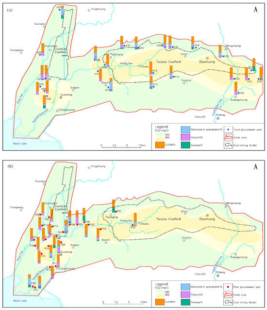 Figure 5a,b illustrate the distributions and sources of karst water and pore water in the study area. The distribution contour of sulfate indicates that the concentration of sulfate in the groundwater is increasing in and surrounding the Taozao coalfield, exceeding the groundwater quality standard of 250 mg/L. In particular, sulfate concentrations at some points in the central part of the coalfield exceed 350 mg/L. The analysis of sulfate sources indicates that the average contribution percentages from sulfide minerals, gypsum dissolution, atmospheric precipitation, and sewage sources in karst water are 64.35%, 16.00%, 12.62%, and 7.04%, respectively. This suggests that sulfate in karst water is primarily derived from the oxidation of sulfide minerals, with some locations exhibiting sulfide mineral contributions as high as 86%. The average contribution percentages from sulfide minerals, gypsum dissolution, atmospheric precipitation, and sewage sources in pore water are 65.13%, 18.30%, 8.55%, and 8.00%, respectively. This indicates that sulfate in pore water also primarily originates from the oxidation of sulfide minerals, with some locations showing sulfide mineral contributions as high as 83%. From the distribution of sampling points, it can be observed that in the vicinity of the western boundary of the Taozao coalfield, the ratio of sulfate in Quaternary pore water originating from the oxidation of sulfide minerals is relatively high, while the ratios in pore water are low in most areas. The values of the other three sources of sulfate pollution are generally similar, indicating that these sources of pollution also contribute to varying degrees of contamination in different water bodies.