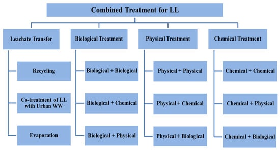 Numerous research and review studies have been conducted, examining both single treatment processes and combined treatment processes for different types of LL treatment. Notably, these studies have primarily focused on the characterization, composition, and generation of LL [,]. However, none of these reviews have specifically addressed the need for a comprehensive analysis of the existing literature solely pertaining to integrated treatment processes for LL treatment. The aim of this review is to evaluate the efficacy of different combined treatment processes and to discuss limitations and future perspectives for each process, in addition to discussing its mechanism of action. This manuscript aims to enhance researchers’ understanding of the characteristics of various combined treatment processes, their combinations, and the rationale behind arranging each process as pre- or post-treatment based on leachate characteristics. Additionally, it addresses the identified gaps encountered by many researchers in previous studies. The authors conclude the manuscript by offering recommendations for the effective implementation of combined treatment for LL. The major findings and conditions of the available research will be summarized for each combined process in a table to make comparisons easier. The suggested treatment process for LL is shown schematically in Figure 1.