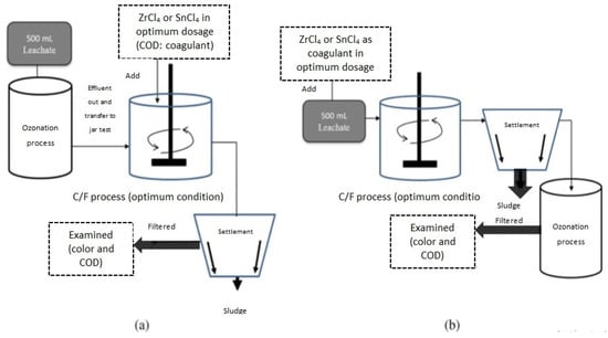 Schematic diagram of combined treatment: (a) ozonation as pre-treatment followed by coagulation; (b) coagulation followed by ozonation as polishing process []. (CCC License Number 5751501056682).