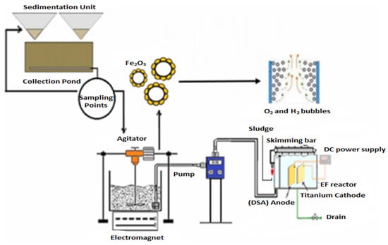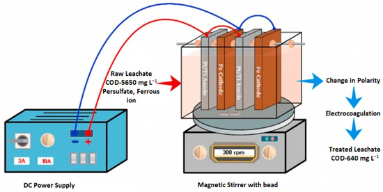 Nidheesh [] conducted a study to investigate the treatment of stabilized LL utilizing a combination of sulfate-radical-associated electro-chemical AOPs (SR-EAOPs) followed by EC (SR-EAOP + EC). The electrochemical processes were carried out in a single step, as shown in Figure 7.