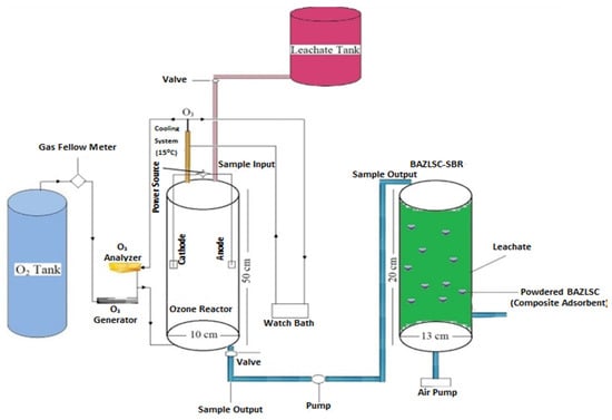 Different treatment processes have been used for the treatment of LL, with varying degrees of success []. Conventional processes, including physical, biological, and chemical treatment processes, have been used for LL treatment []. Chemical treatments, including reverse osmosis (RO) [] and coagulation–flocculation (C/F) [], and electrochemical treatments such as electro-Fenton (EF), electro-oxidation (EO), and electro-coagulation (EC) [,,], have also been effective. Physical treatment processes such as adsorption [] and filtration [] are commonly used to treat LL. Additionally, various biological treatment processes have been investigated successfully under both aerobic and anaerobic conditions. For instance, Contrera et al. [] implemented the sequencing batch reactor (SBR) process to effectively treat LL. However, each treatment process has its own set of advantages and disadvantages. After increasing the age of LL, the effluent becomes more complex, the biodegradability (BOD5/COD) decreases, and bio-refractory pollutants emerge, presenting challenges for the aforementioned treatment processes when used individually [,]. Frequently, a single treatment process fails to treat leachate from landfills to a level that meets the necessary standards for environmental release [,,]. Therefore, Mojiri et al. [] and Jamrah et al. [] strongly recommend the implementation of a combination of chemical, biological, and physical treatment processes to achieve effective treatment outcomes.