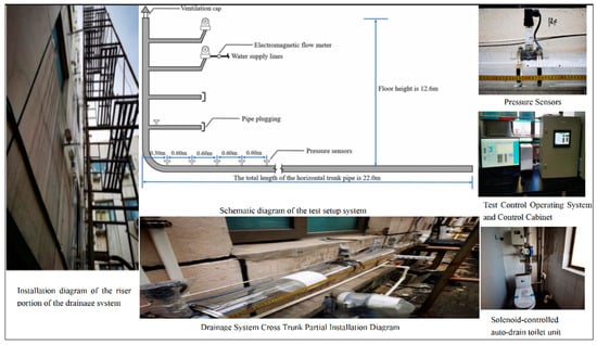 As shown in Figure 1, a four-story (12.6 m) drainage test device was constructed at Beijing Jianzhu University, meeting relevant standard specifications []. The total height of the drainage system stood at 12.6 m, with the first floor measuring 3.2 m and the subsequent floors (second to fourth) each measuring 3.6 m. The horizontal branch pipes on the second to fourth floors are linked to the drainage riser by a 90° water tee, featuring a length of 0.7 m and a slope of 0.012. At the base of the building, the drainage riser is connected to a 22.8 m long horizontal main via a double 45° elbow connection device. Water flow is directly discharged from the terminus of the horizontal main pipe. The proportion of the test device is the same as in the real scenario.