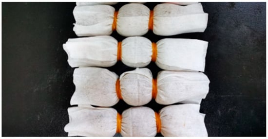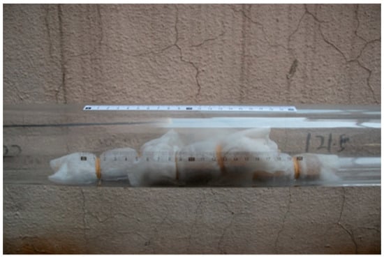 Figure 6 shows the solid simulant. The standard for manufacturing the solid simulation in this experiment was based on “Sanitary Ceramics” (GB6952-2015) []. Each solid simulation weighed about 103 g, containing 78 g of water and 22 g of sand, with a density of about 1.2 g/cm3. After filling the housing with water, the length was about 230 mm, the diameter was about 25 mm, and it was evenly divided into three parts. Both ends were tied with rubber bands at equal distances [].