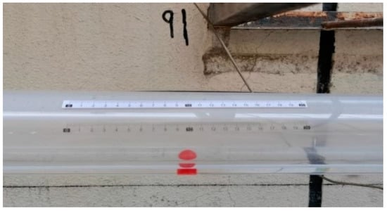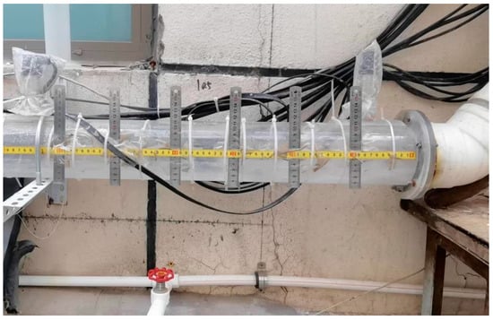 The hydraulic jump and full-degree test of the building’s horizontal main drain are shown in Figure 7. The hydraulic jump was obtained by observing the maximum height of the water level in the drainage horizontal main drain, which is an important parameter that characterizes the fluid behavior of the drainage drain. The full degree is the ratio of the hydraulic jump height to the drain diameter, which is an important parameter that characterizes the ratio of gas and liquid phases in the drainage drain. According to relevant research [], the location of the hydraulic jump mainly occurs in the range of 0–60 cm from the center of the riser.