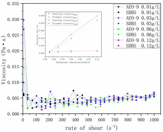 Figure 10 illustrates that for AEO-9, the starting viscosity at concentrations of 0.03 g/L, 0.06 g/L, and 0.12 g/L is 1.62, 2.63, and 4.87 times higher than at 0.01 g/L, with the ultimate viscosity being 1.03, 1.08, and 1.13 times higher. Similarly, for SDBS, the starting viscosity at these concentrations are 1.45, 2.51, and 4.58 times higher than at 0.01 g/L, respectively, with the ultimate viscosities 1.04, 1.07, and 1.15 times higher compared to 0.01 g/L. This indicates that the starting viscosity and the ultimate viscosity are positively correlated with the concentration of surfactants. This correlation may be attributed to the increased tendency of SDBS and AEO-9 in aqueous solutions to transition from a loose, disordered distribution to self-assemble into micelle structures as the concentration rises [], thus elevating the starting viscosity. Under high shear rates, a shear-induced phase transition occurs, promoting the dispersion and reorganization of micelle structures due to entanglement and hydrogen bonding among flexible micelles in SDBS and AEO-9 solutions, resulting in spherical or rod-shaped micelle formations. As the concentration increases, the number of micelles increases, and the interaction between micelles and water molecules and micelles increases, thereby increasing the ultimate viscosity [,].