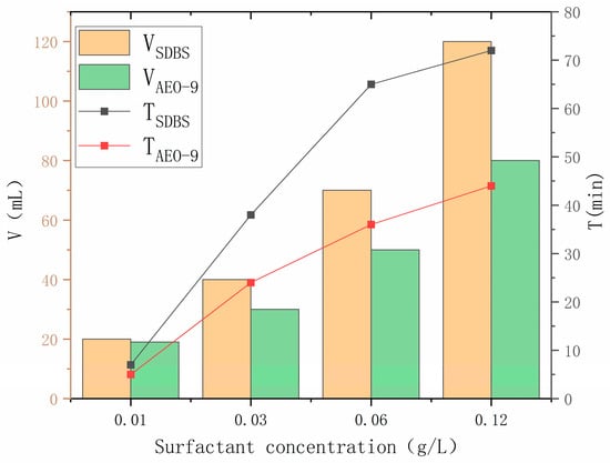 As depicted in Figure 11, for SDBS, the foaming ability at concentrations of 0.03 g/L, 0.06 g/L, and 0.12 g/L are 2 times, 3.5 times, and 6 times higher, respectively, compared to 0.01 g/L, with foam stability increasing by 5.4 times, 9.2 times, and 10.3 times, respectively. Similarly, for AEO-9, the foaming ability at these concentrations is 1.58 times, 2.63 times, and 4.2 times higher, respectively, with foam stability increasing by 4.8 times, 7.2 times, and 8.8 times, respectively. These findings indicate a positive correlation between surfactant concentration and both foaming ability and foam stability. This relationship arises because as the concentrations of SDBS and AEO-9 increase, the propensity of surfactant molecules to dissolve in aqueous solutions rises, reducing the surface tension of the solution, lowering the energy required for bubble formation, and consequently enhancing foaming ability []. This increase in the surfactant concentration results in a higher air content in the aqueous solution, a tighter interfacial arrangement, and increased apparent viscosity. Additionally, the presence of hydrophilic and hydrophobic groups in SDBS and AEO-9 surfactants enhances foam stability through strong electrostatic repulsion [].