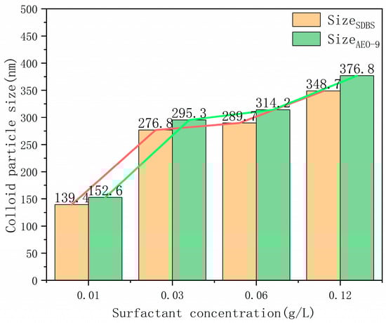 Upon comparing the colloidal particle sizes of AEO-9 and SDBS at different concentrations, it was noted that at concentrations of 0.01 g/L, 0.03 g/L, 0.06 g/L, and 0.12 g/L, AEO-9 had colloidal particle sizes 2.37%, 4.83%, 5.60%, and 9.26% larger than SDBS, respectively. This indicates that AEO-9 has a larger colloidal particle size compared to SDBS, which is potentially attributable to the properties inherent to AEO-9. Compared with SDBS, on the one hand, AEO-9 has a higher solubility, which reduces the energy for single molecules to form micelles in aqueous solutions, thereby facilitating the formation of micelle structures []. On the other hand, upon its dissolution in aqueous solutions, AEO-9 exhibits smaller molecular particle sizes and larger specific surface areas, leading to higher solubility and surface energy. Consequently, AEO-9 is more prone to adsorption and aggregation with neighboring molecules, resulting in larger colloidal particle sizes, in line with the observations in Section 3.1.1.