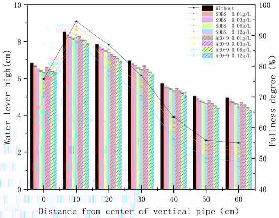 The hydraulic jump and full degree in the horizontal main drain at different concentrations of SDBS and AEO-9 are shown in Figure 13.