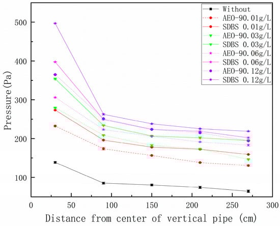 The air pressure of SDBS and AEO-9 drainage horizontal main drain at different concentrations under 6 L water volume are shown in Figure 14.