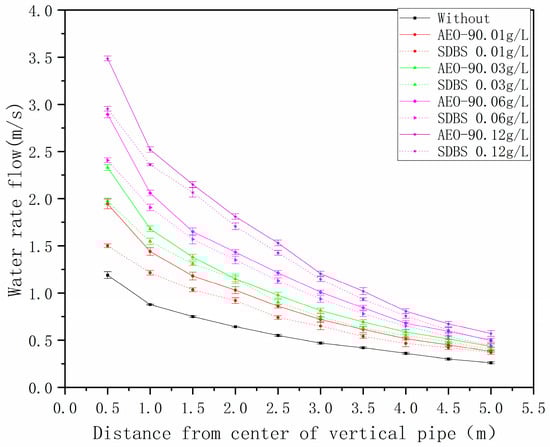 The velocity in the drainage horizontal main drain under different concentrations of SDBS and AEO-9 with a 6 L water volume are shown in Figure 15.