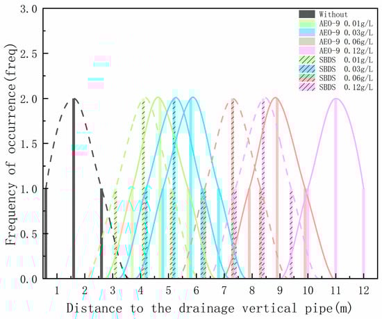 The deposition distance of 200 g of solid simulant washed with different concentrations of SDBS and AEO-9 during drainage in the horizontal main drain under 6 L of water is shown in Figure 16.