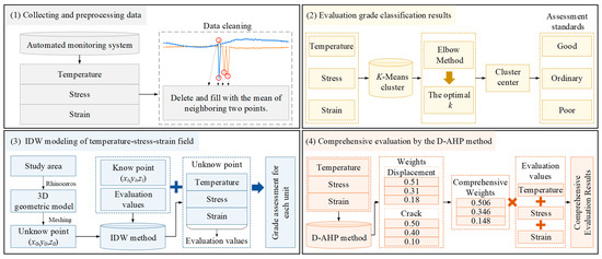 To comprehensively assess the safety status of the dam, this paper adopts the following four modules: (1) collecting and processing long-term monitoring data of dam temperature, stress, and strain, (2) applying the K-means to classify temperature, stress, and strain data to determine grading criteria, (3) conducting a grade assessment of stress, strain, and temperature for each unit using the IDW method, and (4) utilizing the D-AHP method to calculate the weights of each indicator for comprehensive evaluation. Figure 1 illustrates the overall workflow of the methods proposed in this paper.