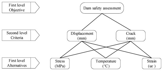 The details of the D-AHP method can be found in Deng et al. [27]. According to the theory, we constructed the D-AHP model for dam safety evaluation, as shown in Figure 2.